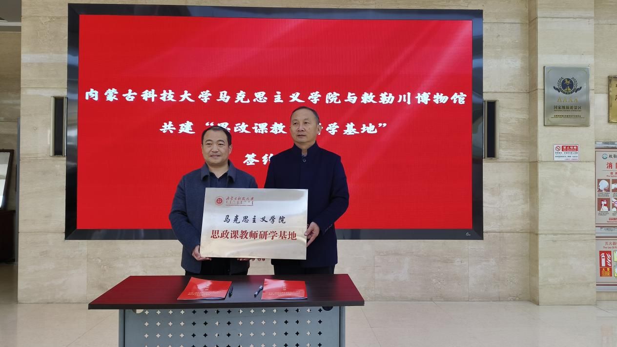 首先,2007so太阳集团副院长杨德桥与土右旗敕勒川博物馆馆长赵俊峰共同签署“思政课教师研学基地”共建协议,并举行授牌仪式。双方一致表示,2007so太阳集团在土右旗敕勒川博物馆设立“思政课教师研学基地”,通过一系列的合作共建举措,促进校地双向赋能、同频共振,力争在学习研究、实践教学、社会服务、精神传承、校馆合作等领域取得建设性的效果。