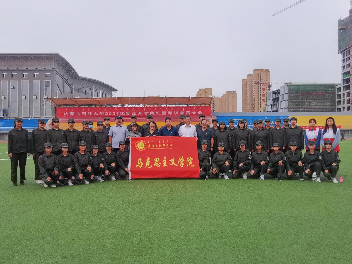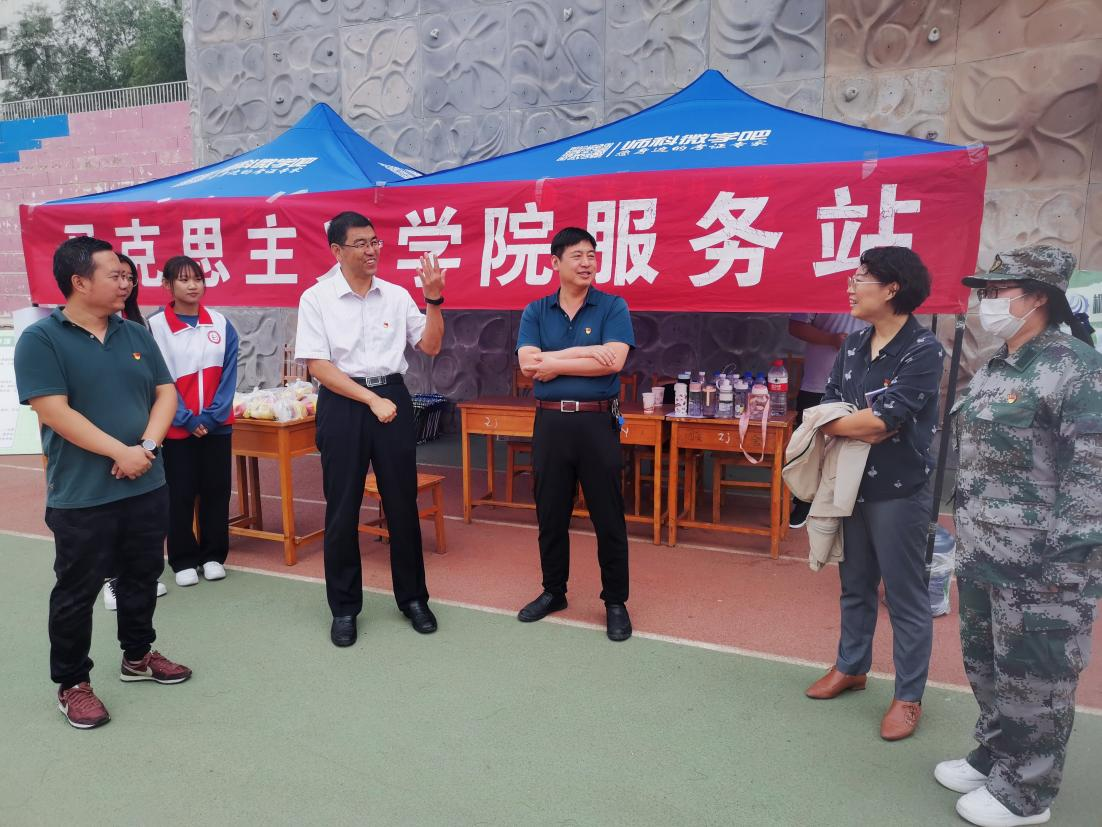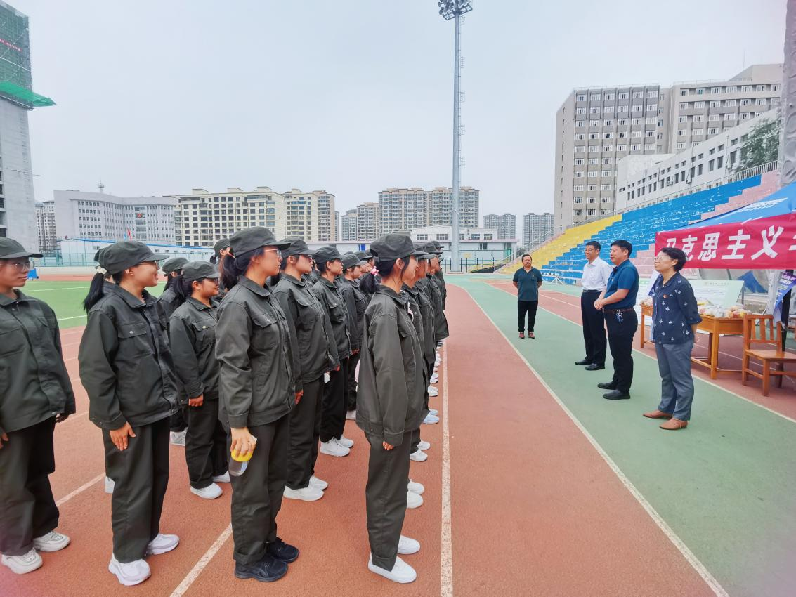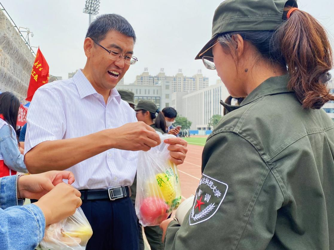 2021年9月18日上午,2007so太阳集团党总支书记马广辉,院长张光存,党总支副书记、副院长柴艳莎,综合办主任范炜,辅导员王海朋来到军训营地,看望我院2021级学生及随训教师王姗姗。