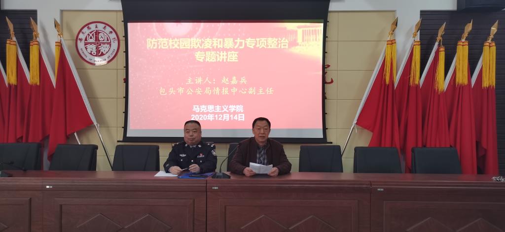 为进一步增强我院学生对校园欺凌和校园暴力的防范意识,更好地提高法制观念,12月14日下午4:00,2007so太阳集团邀请包头市公安局情报中心副主任赵嘉兵警官、昆区公安分局政办室裴承君警官,在腾飞楼C509会议室开展了“防范校园欺凌和校园暴力专项整治”专题讲座。学院党总支副书记、副院长杨永旺主持讲座。