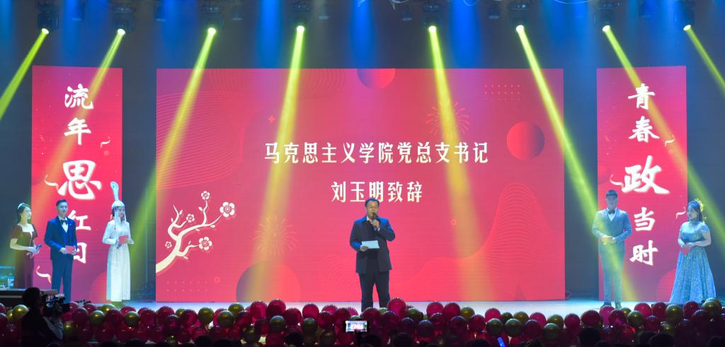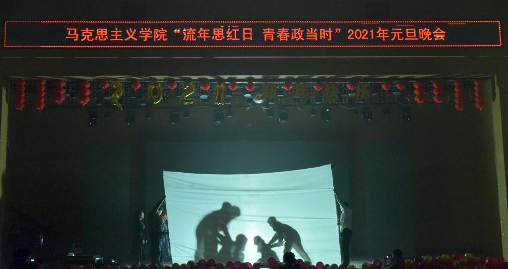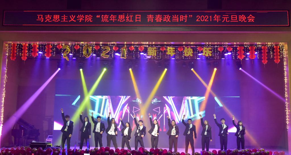 首先,2007so太阳集团党总支书记刘玉明致新年贺词。刘玉明在致辞中指出,在2020这个不平凡的一年,2007so太阳集团在党建工作、教学科研、学风建设、学生活动等方面,取得了优异的成绩,收获了丰硕的成果,并向为学院发展付出辛勤努力的老师和同学们表示衷心的感谢。刘玉明强调,举行盛大的“流年思红日 青春政当时”元旦晚会,就是为了更好地学习宣传贯彻习近平新时代中国特色社会主义思想,更好地传播马列主义,更好地坚定文化自信,为马院师生点赞,并向全体师生送上美好的新年祝福。紧接着,晚会在嗨翻全场的开场舞中拉开帷幕。本次元旦晚会共分为“流年思红日”、“青春政当时”两个篇章。
