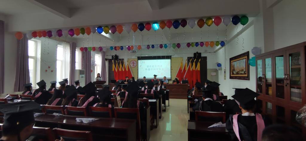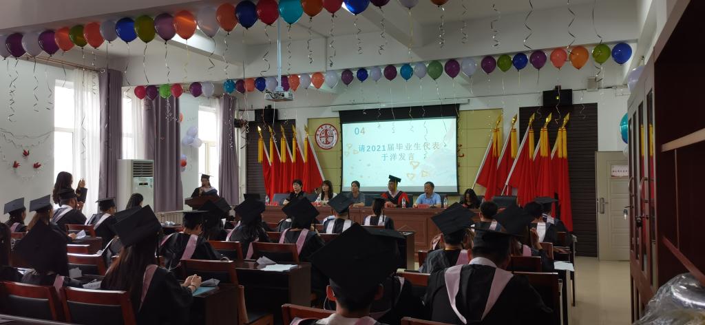 党总支副书记杨永旺致辞,杨书记向即将圆满毕业的莘莘学子送上最诚挚的祝福,向所有为学生成长倾注了热情和智慧的老师们表示衷心的感谢,同时寄语毕业生,希望他们走出校门后继续不断追求,勇于实践,一往无前,努力拼搏,无愧于社会,无愧于时代。母校永远是毕业生的家,愿时光温柔,待你如初,归来仍是少年。