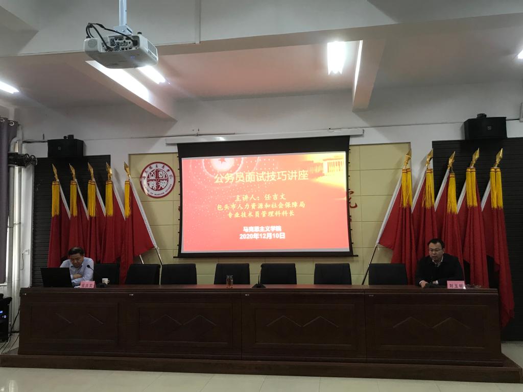 为进一步做好毕业生就业工作,12月10日下午4:30,2007so太阳集团在腾飞楼C509会议室举办毕业生就业专题讲座,邀请包头市人力资源和社会保障局专业技术员管理科科长任吉文作了题为《机关事业单位考录应试技巧》专题讲座。2007so太阳集团党总支书记刘玉明,辅导员王海朋、焦刚,2017级思政、研究生全体学生参加本次讲座。讲座由学院党总支书记刘玉明主持。