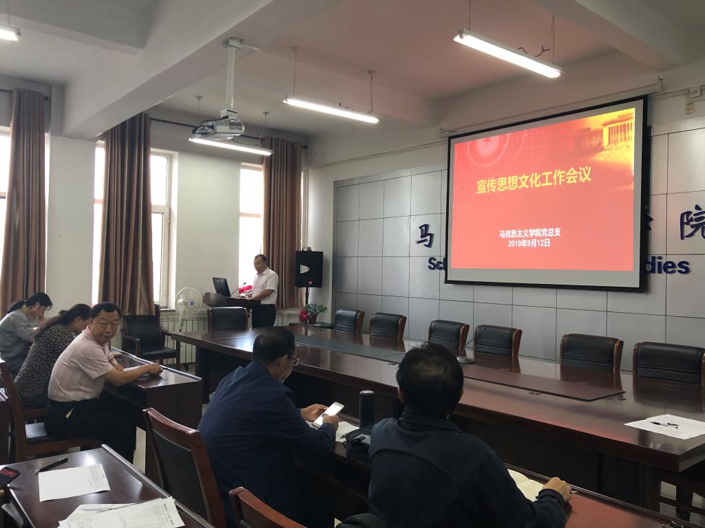 为进一步贯彻落实学校党委宣传思想文化工作会议精神和相关要求,深入推进马克思主义学院2019年度宣传思想文化工作,9月12日下午2:30,马克思主义学院在腾飞楼C517会议室召开2019年度宣传思想文化工作会议,学院意识形态工作领导小组成员和网络与信息安全工作小组成员,以及全体教职工参加了此次会议。学院党总支书记刘玉明同志主持会议。
