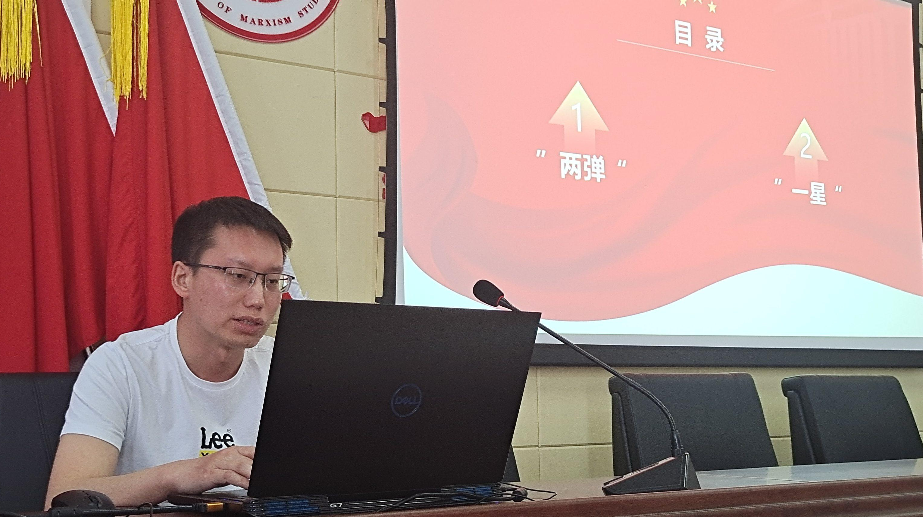 入党积极分子宋宏旭以“两弹”主要人物钱学森、邓稼先的生平事迹和“一星”东方红一号卫星发射为例,揭示了新中国初期在复杂的国际国内形势下我国大力发展科技的重大意义。