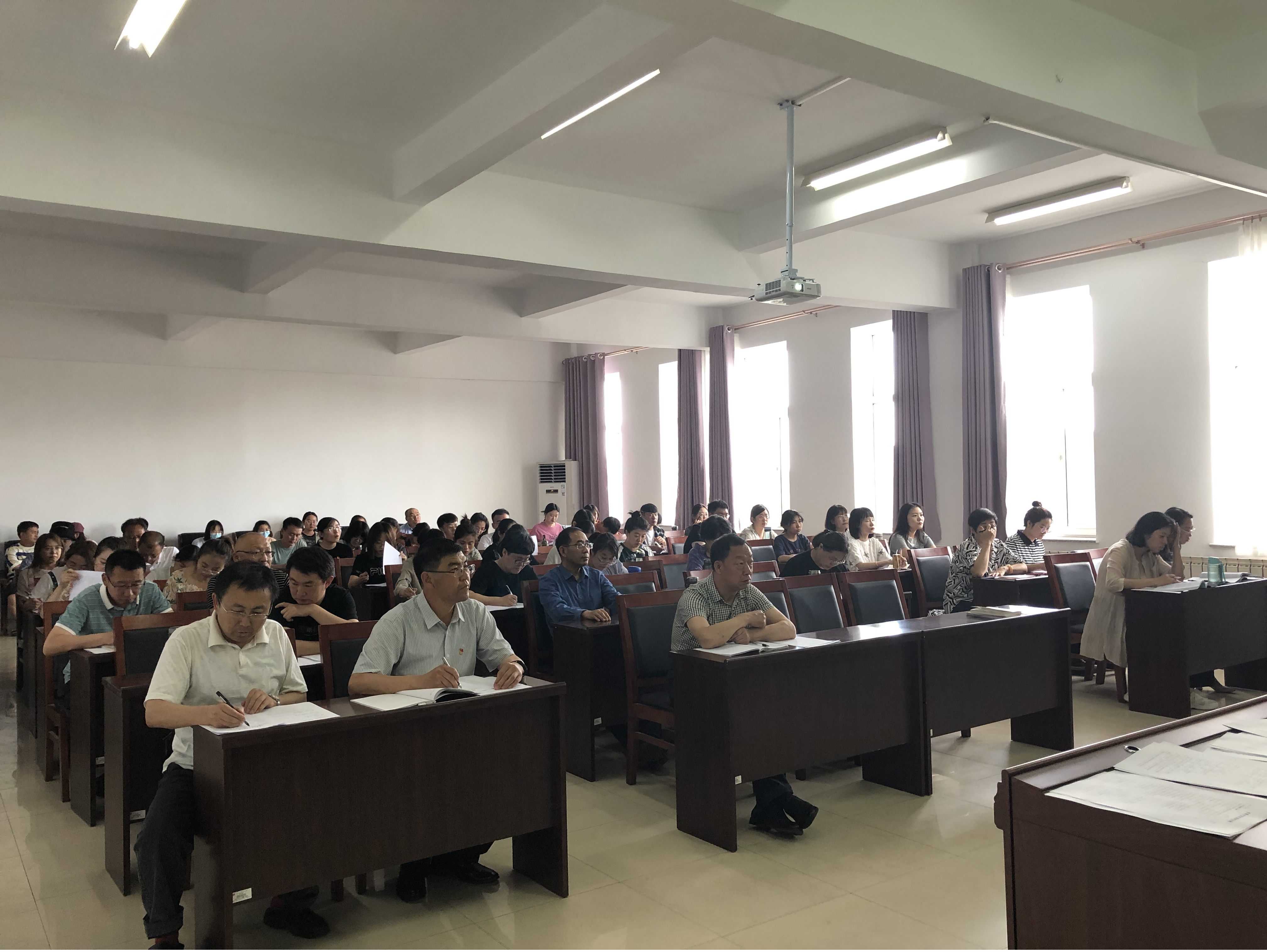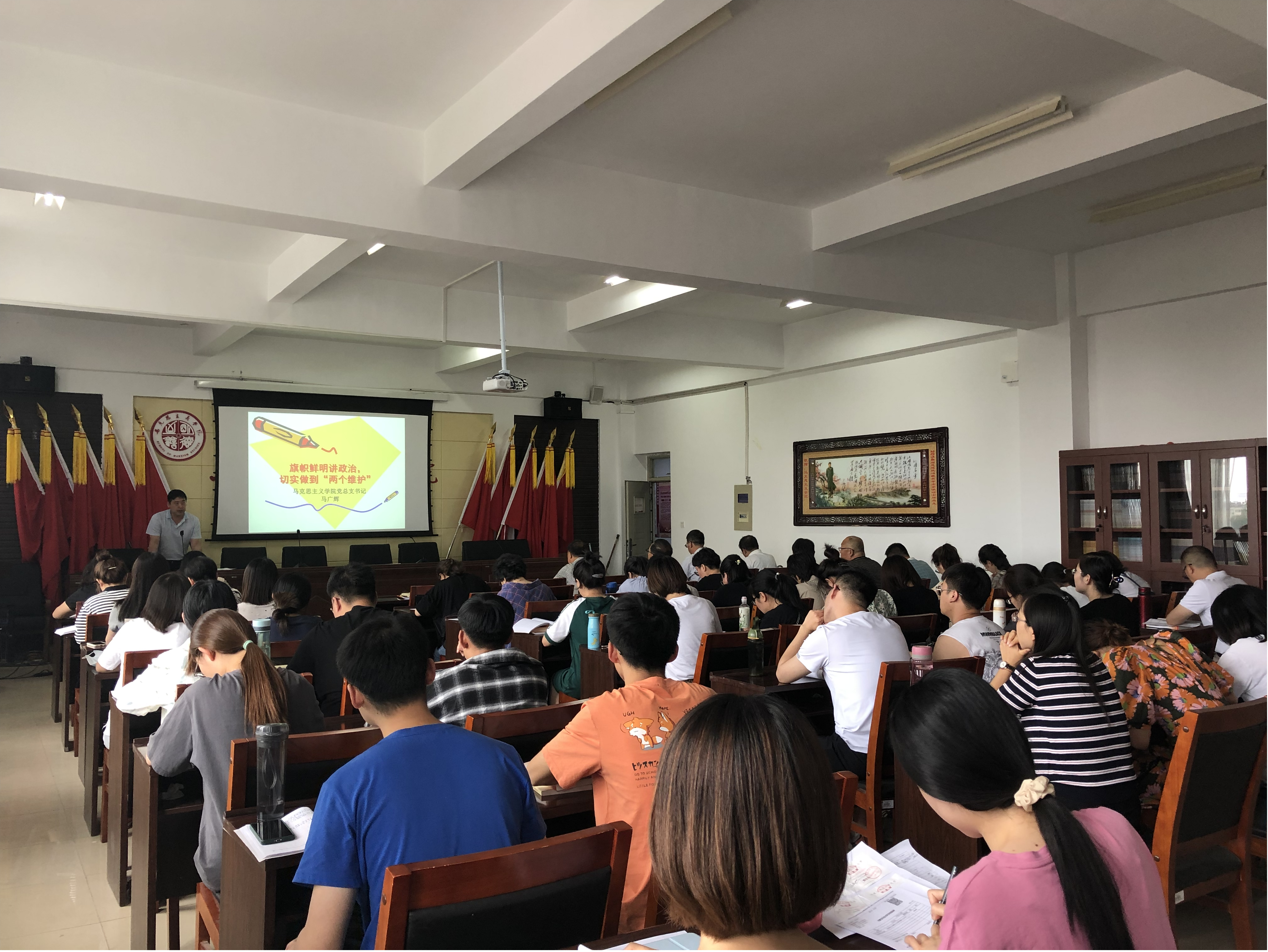 621日下午,党总支书记马广辉在腾飞楼C509会议室作了题为《旗帜鲜明讲政治,切实做到“两个维护”》的专题党课。全体党员聆听党课。