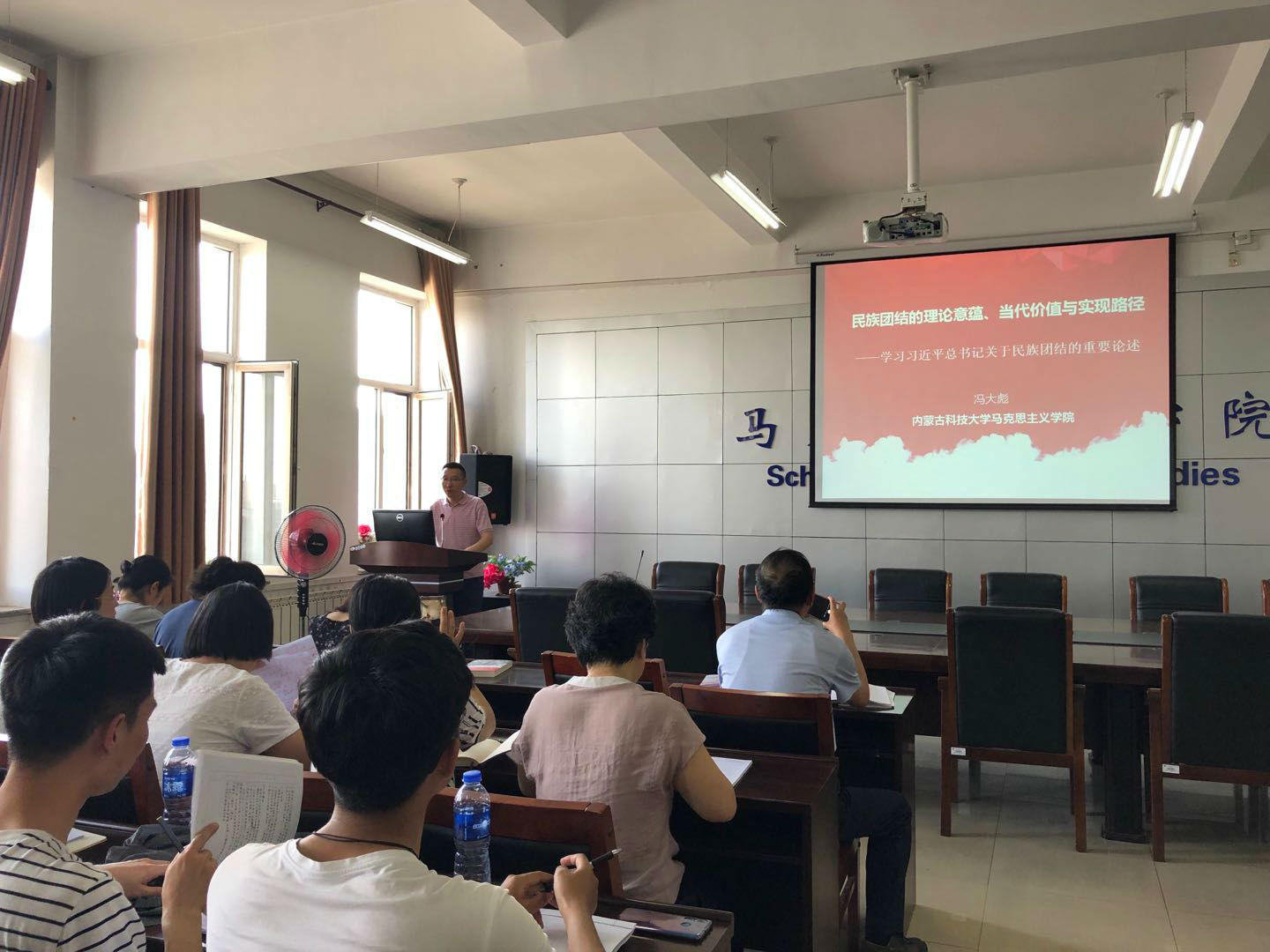 为深入推进“思想再解放笃行新发展理念,推动高质量发展大学习大讨论”,6月6日2007so太阳集团在腾飞楼C座517会议室举办民族团结相关专题讲座。2007so太阳集团党总支书记刘玉明主持讲座,讲座由2007so太阳集团副教授冯大彪主讲,讲座题目为《民族团结的理论意蕴、当代价值与实现路径——学习习近平总书记关于民族团结的重要论述》,讲座分为三个方面,分别是民族团结的理论意蕴、民族团结的当代价值、民族团结的实现路径。全体教师参加本次讲座。同时,本次讲座也作为民族团结教育的主要内容,学生党员、少数民族学生代表聆听本次讲座。