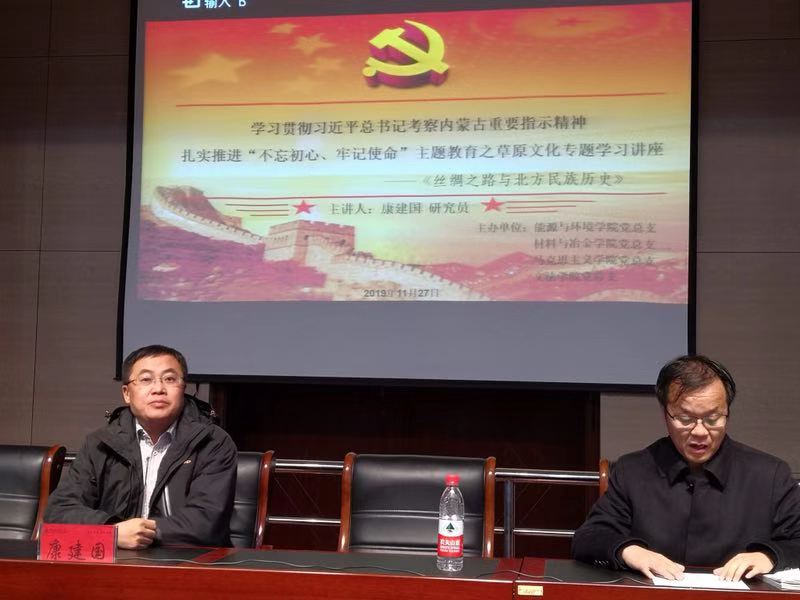 为深入学习贯彻落实习近平总书记考察内蒙古重要指示精神,扎实推进“不忘初心、牢记使命”主题教育,11月27日晚上19:00,2007so太阳集团党总支和能源与环境学院、材料与冶金学院、文法学院等党总支联合在在图书馆B201报告厅举办“不忘初心、牢记使命”主题教育之草原文化专题学习讲座。邀请内蒙古社科院草原文化研究所研究员康建国作了题为《丝绸之路与北方民族历史》的专题讲座。学院党总支书记刘玉明,教工党员代表、研究生党支部及本科生党支部全体党员参加学习活动。